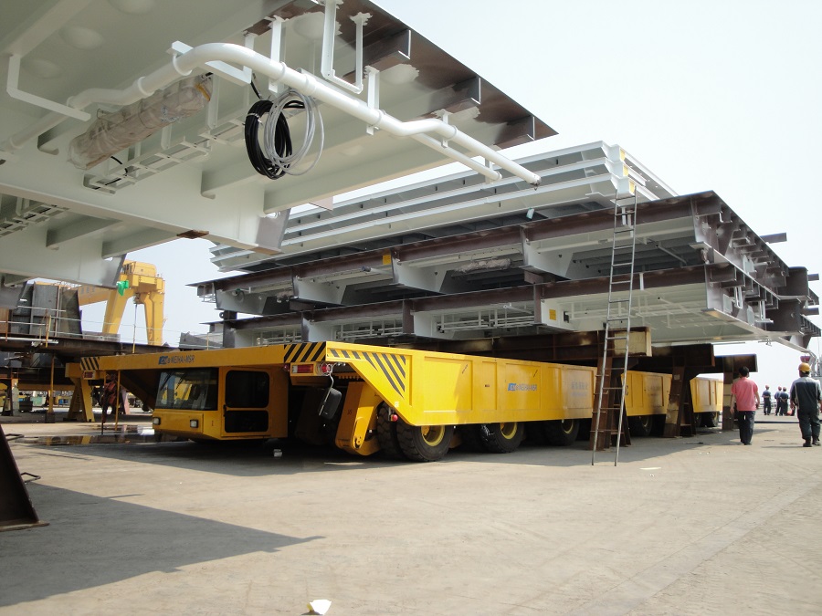 320T和500T液壓平板車拼車運(yùn)輸造船部件(韓國)